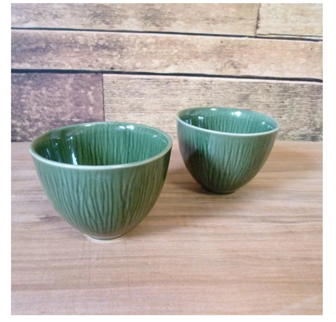 焼け融けた織部の緑が、器の線刻にとどまり生まれる自然な濃淡。